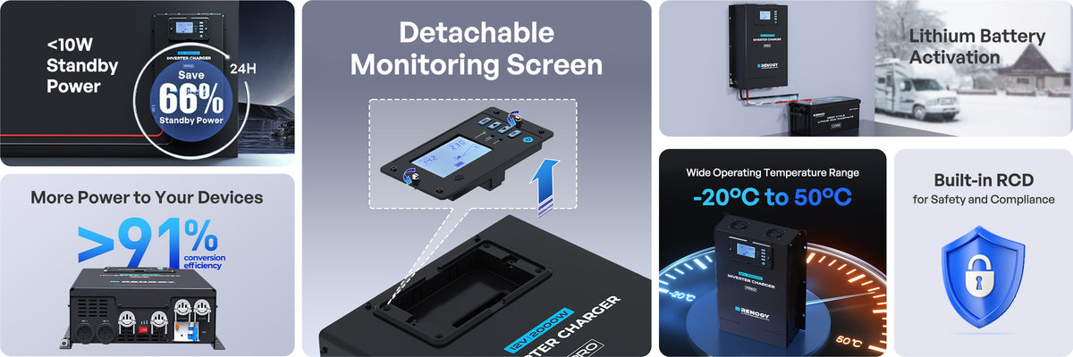 - Over 91% inverter efficiency and <10W standby consumption help extend battery life and minimise energy waste.