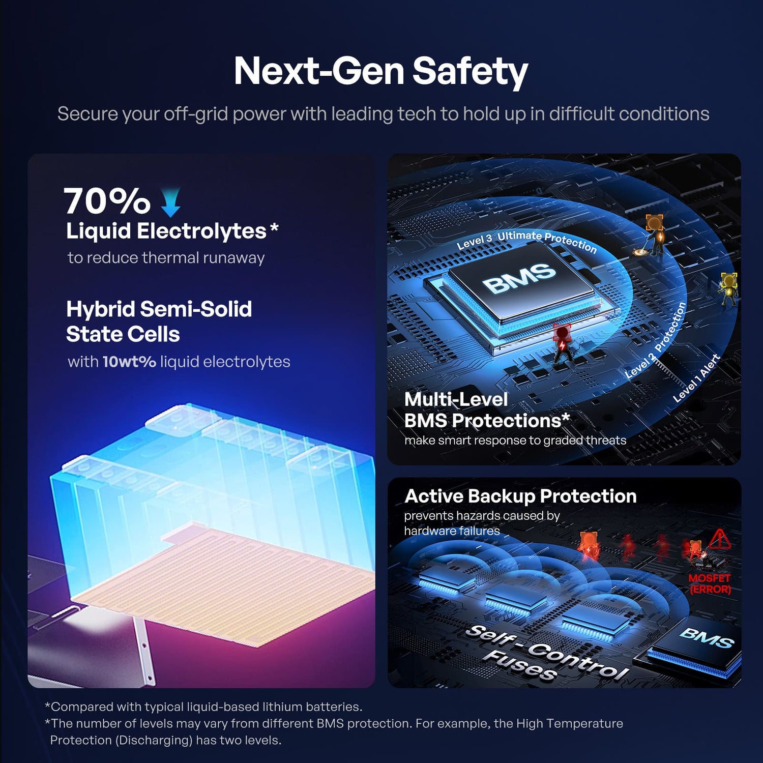 The intelligent battery management system (BMS) deploys targeted defenses at different levels of risk. Rather than shutting everything down at once, the BMS applies the right safeguards when needed to keep your battery safe and power steady.