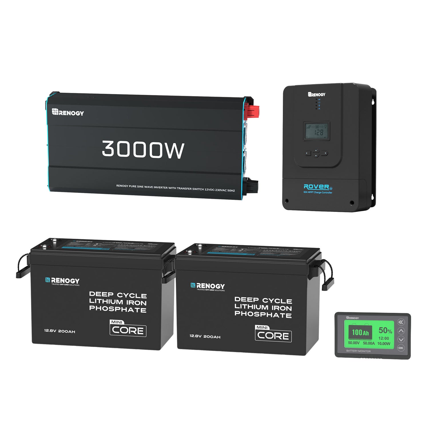 Core Mini 12.8V 200Ah LiFePO4 Battery (x2) 400Ah Total, LiFePO4, 4000+ Cycles The Heart of Your System. Provides a massive, safe power reserve. Run your 12V fridge overnight, charge devices, and use lights without a worry. LiFePO4 is much lighter and lasts far longer than traditional AGM batteries.