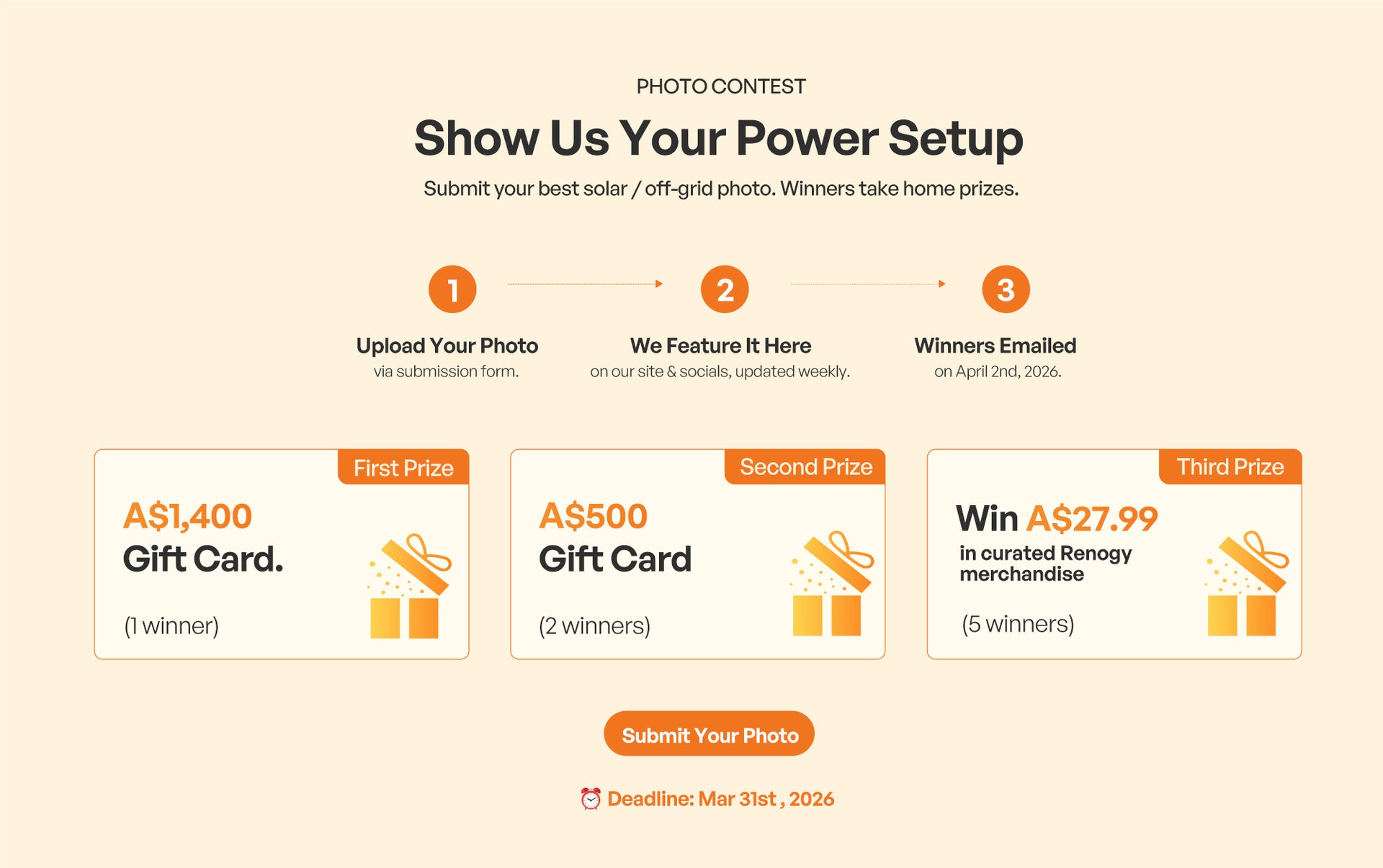 By entering, you grant Renogy a non-exclusive, royalty-free license to use your photo for marketing purposes. You must own all rights to the submitted content.