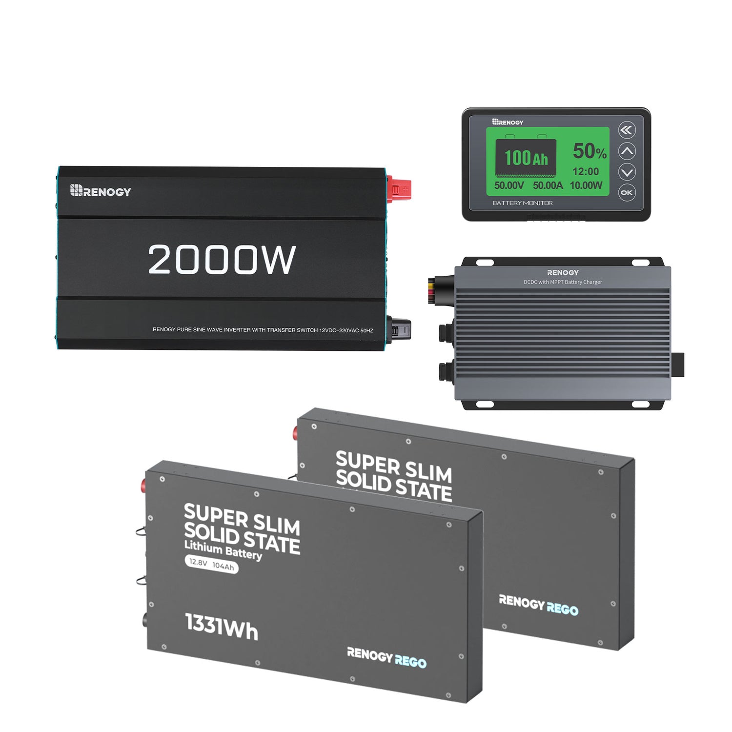 • •COMPLETE 4WD POWER KIT: Includes (2x) 104Ah Super Slim LiFePO4 Batteries, (2x) 200W ShadowFlux Solar Panels, 2000W Pure Sine Wave Inverter, IP67 50A DC-DC Charger with MPPT, and 500A Battery Monitor.